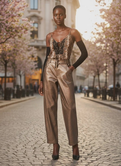 TOP A CANOTTA STAMPA PITONE CON SPALLINE, DETTAGLIO IN PIZZO E ALLACCIATURA SUL DAVANTI.